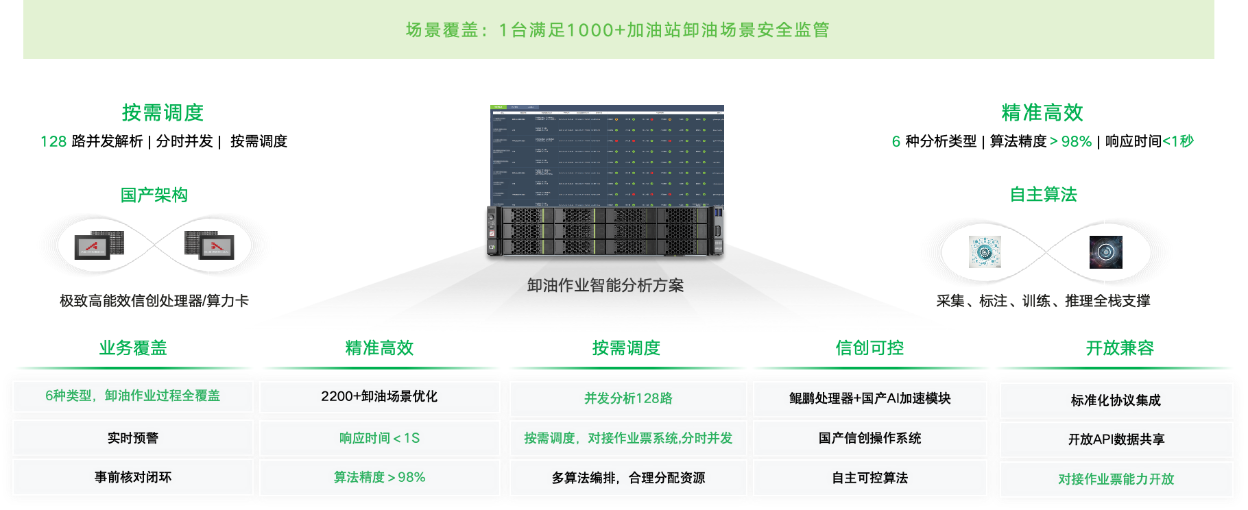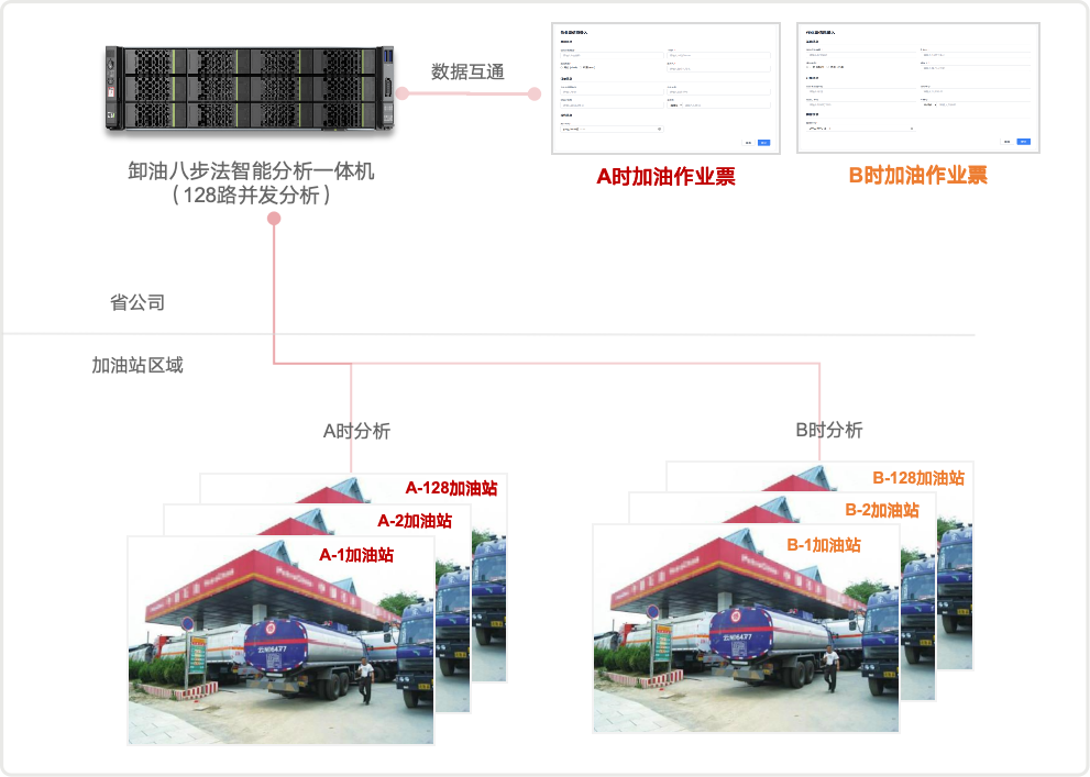 1台覆盖1000+加油站,128路并发分析,对接作业票系统,分时并发,按需调度