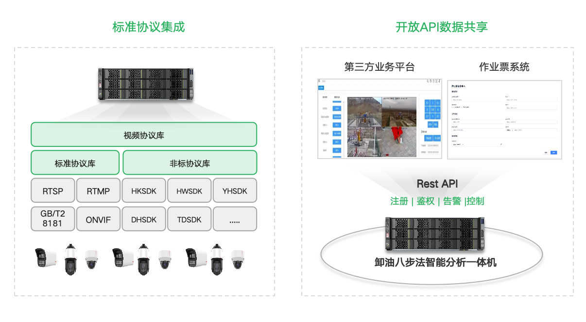 标准协议集成,GB/T28181|ONVIF等多协议集成,对南向各种IPC、NVR、VMS系统等可以无缝对接;数据开放共享,提供RestAPI标准接口共享数据,共享数据包括智能事件实时预计已经历史事件查询等;提供一体机作业票对接能力开放,包括作业启停控制、安全检查及实时告警等;也可主动对接用户提供的作业票系统。