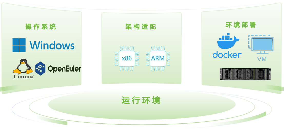 操作系统兼容Windows、Linux、统信UOS、OpenEuler、麒麟等;系统架构涵盖Intel x86、飞腾、龙芯、鲲鹏;灵活部署于VM、云端、服务器等多种环境