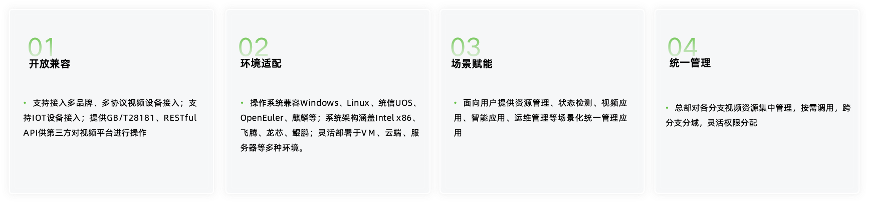 支持跨品牌、跨型号设备的统一管理,跨越局域网、城域网及互联网无缝连接。对外的交互接口调度服务,提供GB/T28181、RESTful API等多协议共享
