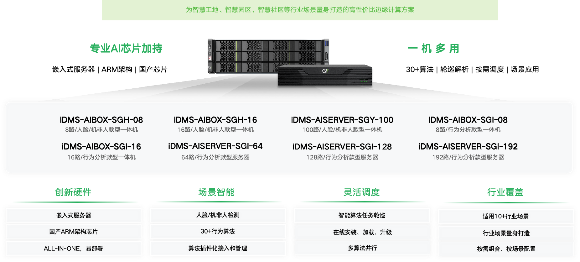适配多种高精度AI算法,为明厨亮灶、 智慧消防 、智慧社区 、智慧加油站 、智慧营业厅 、安全生产 、智慧校园 、智慧工地 、智慧园区等行业场景量身打造的高性价比边缘计算方案