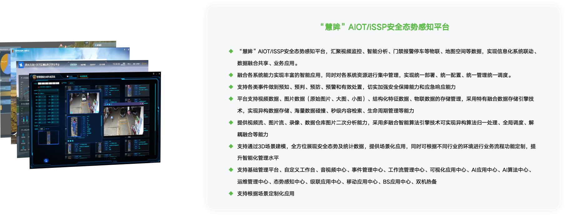 基于三维、AR实景、鸿蒙互联、大模型等,覆盖安防、通行、设备、能耗、环境和事件等子态势,实现包括视频巡更、周界防范、目标布控、人行轨迹、人员/车辆通行、信息发布、能效管理、应急响应等在内的多个应用场景